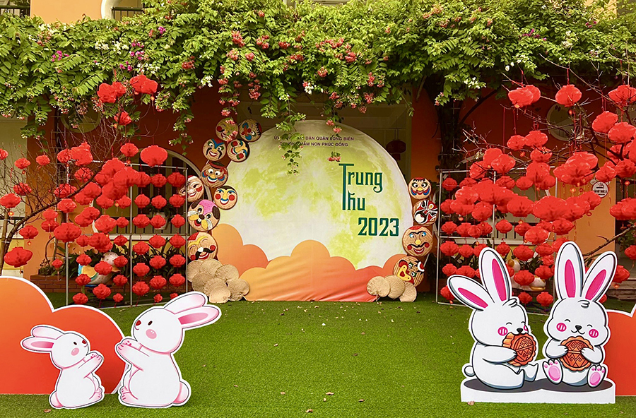 Từ rất sớm các cô giáo đã cùng nhau trang trí, chuẩn bị background thật rực rỡ để các con cảm nhận được không khí vui vẻ, rộn ràng của ngày tết trung thu cũng như giúp các con lưu giữ lại những khung hình thật đẹp ở mái trường MN Phúc Đồng.