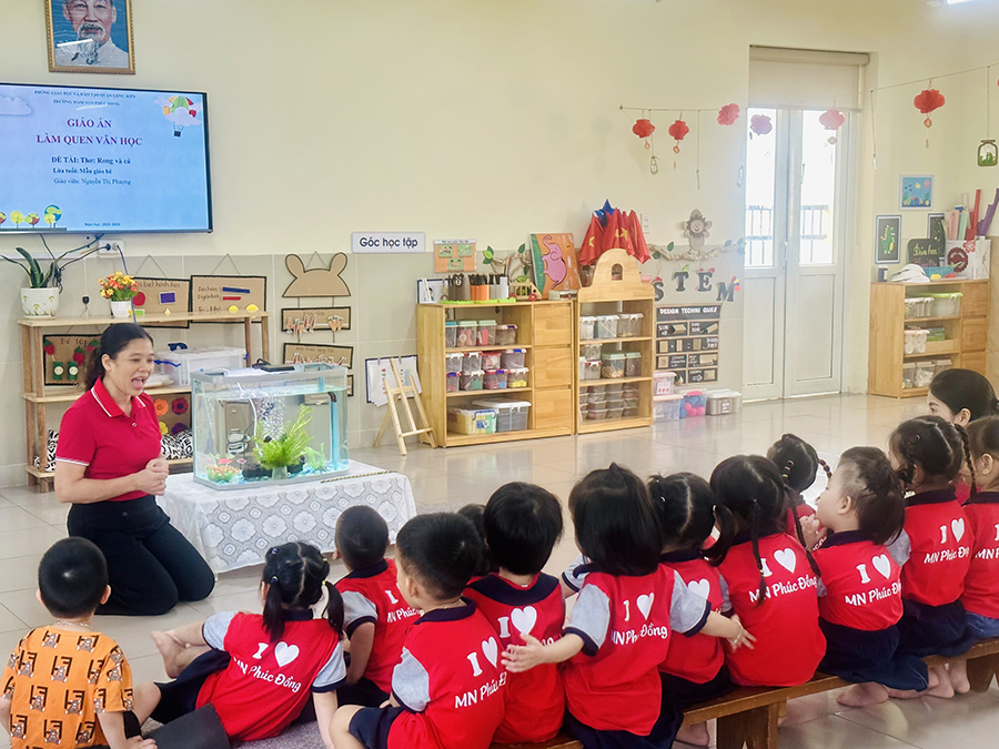 Giờ học sáng ngày 25/10/2023 đã kết thúc trong niềm vui của cô trò cả lớp bởi đồ dùng dạy thơ hôm nay không chỉ là những bản tranh to nhiều màu sắc, mà còn có một bể cá nhỏ rất sinh động cho các bé được quan sát và trải nghiệm thực tế.