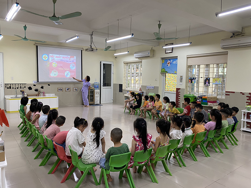 Để công tác phòng chống dịch bệnh của nhà trường đạt kết quả tốt nhất, trong thời gian qua, công tác vệ sinh môi trường đã được nhà trường luôn quan tâm chỉ đạo sát sao, triển khai thực hiện đạt nhiều kết quả tích cực, góp phần quan trọng trong chủ động phòng ngừa, kiểm soát các bệnh truyền nhiễm đặc biệt là dịch sốt xuất huyết. Đặc biệt, các cô giáo cũng chú trong việc cung cấp cho các con những kiến thức về tác hại của dịch bệnh sốt xuất huyết, các yếu tố dịch tễ liên quan đến phòng chống dịch bênh thông qua các video, hình ảnh nhằm trang bị cho các con những kiến thức, kĩ năng ngay từ lứa tuổi Mầm non.