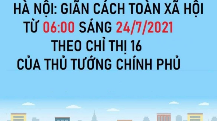Thành phố Hà Nội sẽ thực hiện cách ly toàn xã hội trong vòng 15 ngày kể từ 06h00 ngày 24/7/2021 trên phạm vi toàn Thành phố theo nguyên tắc gia đình cách ly với gia đình; khu phố cách ly với khu phố; thôn bản cách ly với thôn bản; xã, phường cách ly với xã, phường; quận, huyện cách ly với quận, huyện; Thành phố cách ly với tỉnh; cơ sở kinh doanh dịch vụ thiết yếu, phân xưởng, nhà máy sản xuất phải đảm bảo an toàn phòng chống dịch theo quy định.