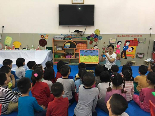 Những ca từ vui nhộn của bài hát “Hạt mưa xinh” đã cùng cô giáo và các bạn lớp mẫu giáo lớn A5 mở đầu giờ học phát triển thẩm mỹ: “Xé dán mưa” đầy hứng thú.