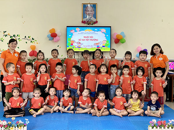 Sau những giờ phút háo hức tại góc check in của lớp và tiết mục múa: Trường Phúc Đồng của em rất vui, các bé và các cô giáo đã hát vang bài Quốc ca với tâm thế nghiêm trang, tự hào đầy xúc động trong không khí tưng bừng rực rỡ cờ hoa.
