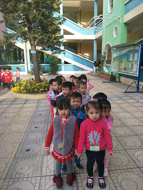 Các bé xếp hàng chuẩn bị lên xe