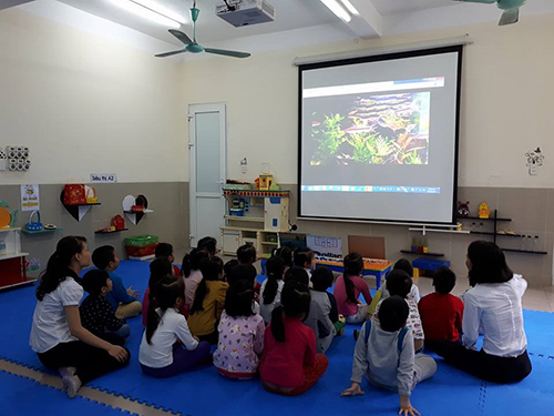 Qua đoạn video cô cho trẻ thấy được có rất nhiều loài cá có hình dạng và màu sắc khác nhau. Sau đó cô cho trẻ quan sát tranh mẫu qua đó cô giúp trẻ ôn luyện lại kĩ năng xé bấm xé đoạn dài ngắn để tạo thành nhiều con cá có hình dạng khác nhau và có tư thế khác nhau để cho bức tranh thêm đẹp và thêm sinh động.