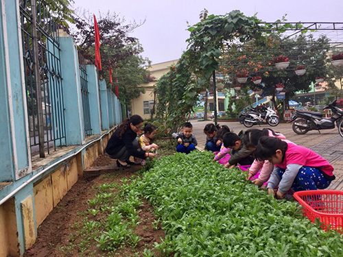 Sau một thời gian thu hoạch rộn ràng tiếng cười, nói, lại vừa được chơi, vừa được học. Cô và cháu lớp MGN B1 đã có khối lượng “ chiến lợi phẩm” không hề nhỏ, đó là những rổ rau đầy Cải Cúc. Với trẻ, các con tỏ ra hứng thú khi được trực tiếp mang sản phẩm vừa thu hoạch xuống nhà bếp của trường để các cô, bác cấp dưỡng chế biến ra món canh bổ dưỡng và ngon miệng cho bữa ăn của trẻ.