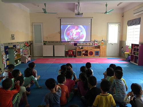 Trước khi chúng tớ được ra sân nặn bánh trôi, A1 chúng mình còn được các cô cho xem video giới thiệu về ngày Tết Hàn Thực và ý nghĩ của ngày Tết Hàn Thực nữa cơ