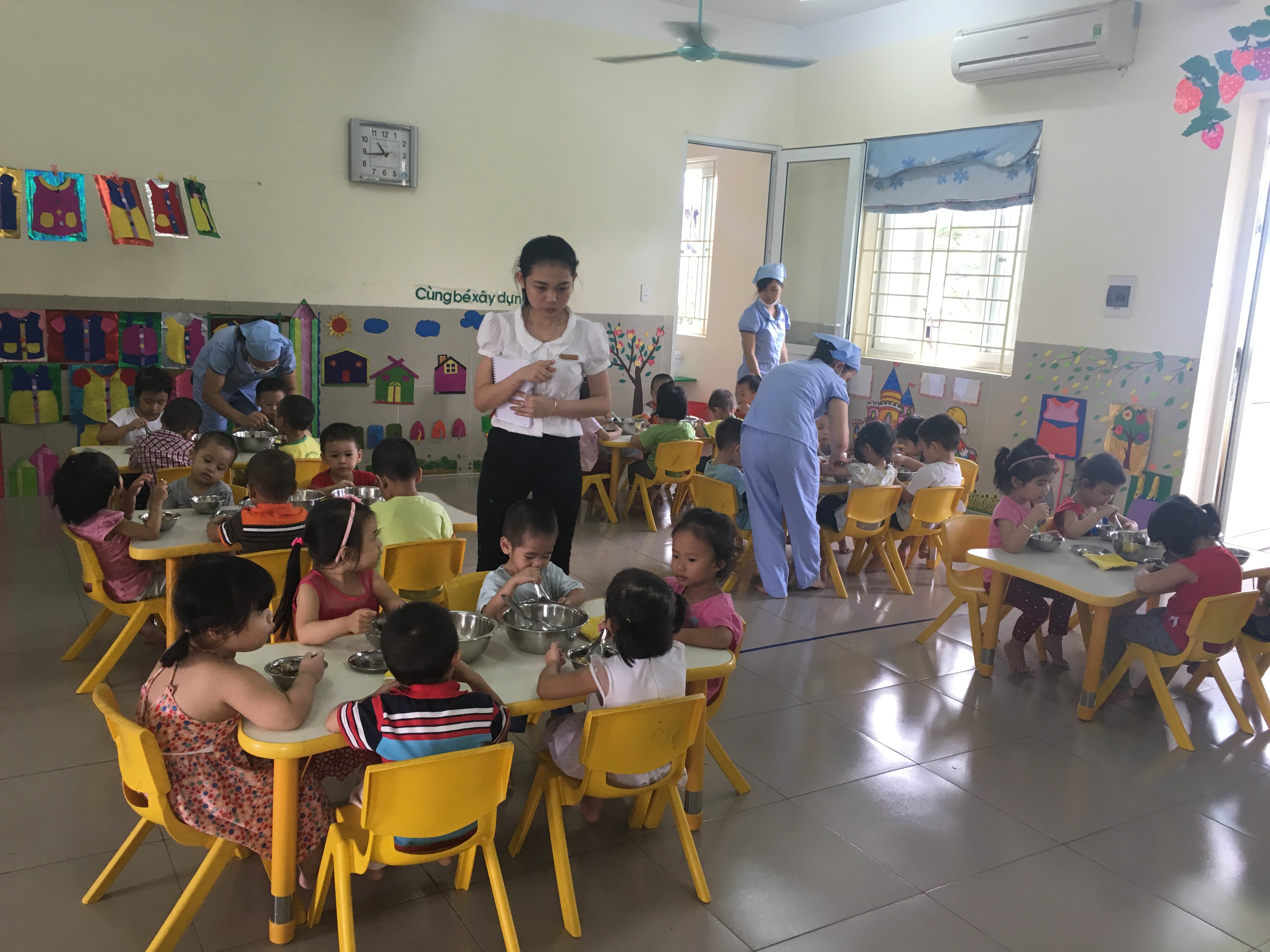 Hôm nay ra quân, có 03 lớp tham gia dự thi, các hoạt động đều được chuẩn bị chu đáo, tổ chức đúng phương pháp, có sự phối kết hợp nhịp nhàng từ các thành viên trong cả lớp, mang lại cho trẻ những bữa ăn ngon miệng, hết xuất và giấc ngủ ngon.