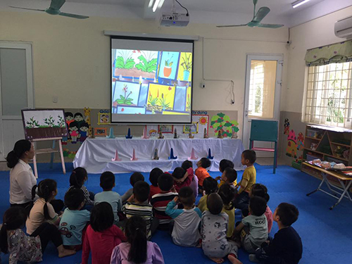 Cô và trẻ đang xem video clip tranh xé dán hoa