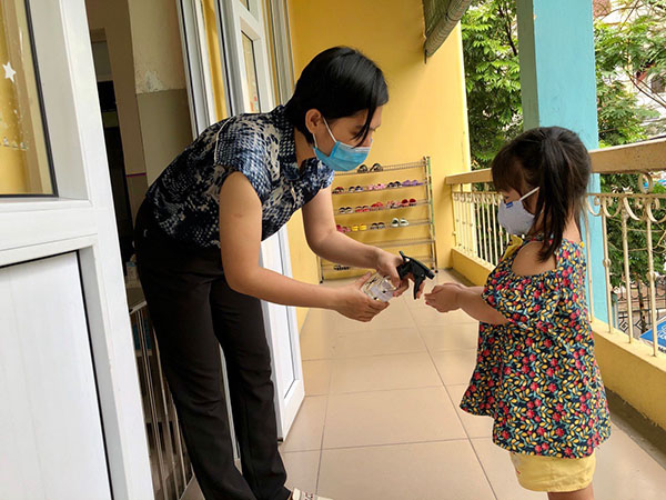 Cô An xịt cồn cho các bé để giữ vệ sinh cá nhân.