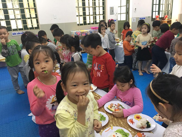 - Thay vì như bát cơm thông thường, trẻ đã được cô dạy cách tạo hình cơm thành những con vật xinh xắn, ngộ nghĩnh,tiếp đến trẻ thỏa sức bày, sáng tạo thêm cỏ cây, hoa lá….. cho đĩa cơm trở nên thật sinh động hấp dẫn. Những bông hoa, ông mặt trời được trẻ xếp vòng tròn từ những hạt ngô, cà rốt hay khuôn cớm trắng trẻ gắn thêm mắt mũi….. Tất cả dưới bàn tay trẻ đĩa cơm trở nên bắt mắt như 1 bức tranh đầy sáng tạo chỉ muốn ngắm nhìn. Không chỉ quan tâm đến thẩm mỹ của mỗi đĩa cơm, cô giáo cũng rất chú trọng đến việc đảm bảo đủ dinh dưỡng cho trẻ trong từng đĩa cơm. Theo đó mỗi đĩa cơm được trẻ lựa chọn thực phẩm để trang trí đều đảm bảo có đủ tinh bột, đạm và rau xanh. Ngoài ra cô cũng khéo léo chọn lựa những loại rau củ có màu sắc để có thêm nhiều vitamin và đặc biệt là đĩa cơm thêm đẹp mắt kích thích trẻ sáng tạo và vị giác của trẻ khiến trẻ thích và biết ăn nhiều loại thức ăn khác nhau. Thông qua hoạt động này giúp trẻ phát triển một số kỹ năng sống cơ bản và tạo ra sân chơi bổ ích để cho trẻ khám phá, trải nghiệm bao điều hay về hoạt động nội trợ, đồng thời giáo dục dinh dưỡng và sức khỏe cho trẻ lứa tuổi mầm non đạt hiệu quả.