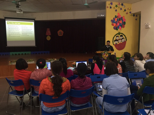 Do đặc thù trình độ giáo viên không đồng đều, đa số giáo viên chưa được tập huấn phần mềm này, một số ít giáo viên đã biết nhưng không thường xuyên sử dụng và một số ít còn lại đã sử dụng thành thạo nên giảng viên đã lựa chọn phương pháp dạy “Cầm tay chỉ việc”, các cô được hướng dẫn lý thuyết rất bài bản, cụ thể, có tài liệu kèm theo, đồng thời thực hành các thao tác, kỹ năng trực tiếp trên máy tính.