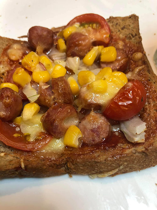- B3: cho lần lượt ngô, hành tây, cà chua bi, xúc xích và pho mai đã bào thành sợi
