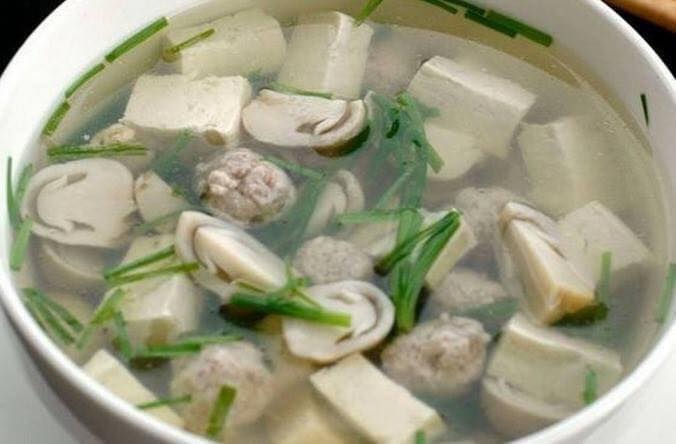 - Bắc nồi cho vào lượng nước đủ nấu canh, nêm 1/2 muỗng cafe muối, sau đó cho thịt viên vào đun trong lửa vừa, khi nấu nhớ hớt bọt cho nước trong. Nước sôi lần 1 thì cho nấm vào nấu tiếp cho sôi lần 2. Tiếp theo trút đậu và hẹ vào nấu cho sôi tiếp lần 3 rồi vặn nhỏ lửa, nêm nếm lại nước mắm, bột ngọt… cho vừa miệng rồi tắt bếp.