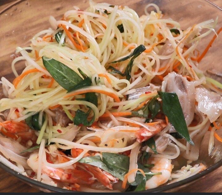1 quả đu đủ xanh, cà rốt, 1 cái tai lợn, nước mắm, muối, chanh, giấm, đường và tỏi.