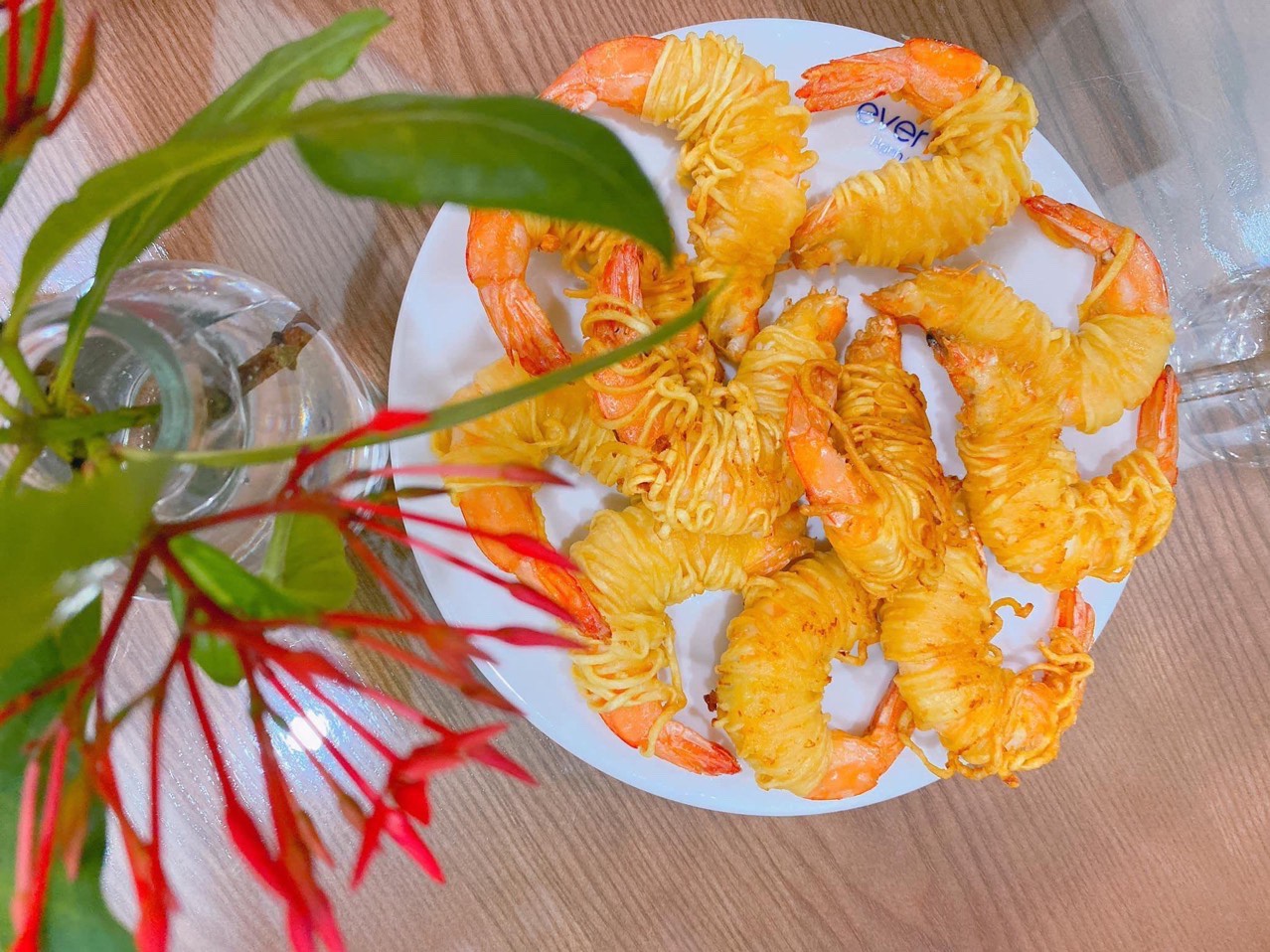Bước 1:Tôm lớp làm sạch, bóc vỏ tẩm bột chiên giòn,khoai Tây thái dài và mỏng (có thể lấy mì thay khoai tây tươi)