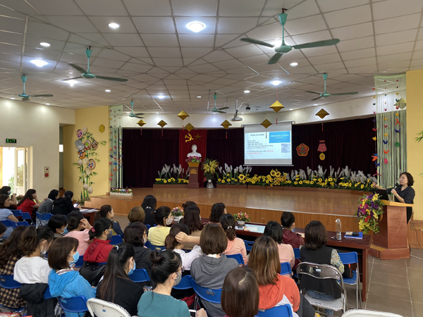 Bà Nguyễn Thị Chinh – Thạc sĩ - Phó trưởng phòng y tế cộng đồng TTYT quận Long Biên đang tập huấn các nội dung cho CBGVNV nhà trường