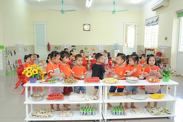 Thời tiết tuy oi và nóng nực nhưng không làm giảm đi tâm huyết với thực đơn buffet đầy dinh dưỡng cho các con của các cô chú nhân viên nuôi dưỡng. Mỗi người một nhiệm vụ, ai nấy đều luôn tay để các món ăn được chế biến nhanh nhất, đẹp mắt nhất. Các cô giáo, cùng tổ văn phòng và ban giám hiệu nhà trường cũng đến từ rất sớm để phụ giúp tổ nuôi chuẩn bị đồ, trang trí cho các món ăn. Để đảm bảo sức khỏe cho các con, BGH nhà trường đã chỉ đạo toàn trường không tổ chức tập trung theo khối giống như các năm học trước mà thực hiện bữa tiệc tổng kết này tại các lớp, các cô và phụ huynh học sinh sẽ kết hợp cùng nhau chăm chút cho các con trong hoạt động ý nghĩa này.