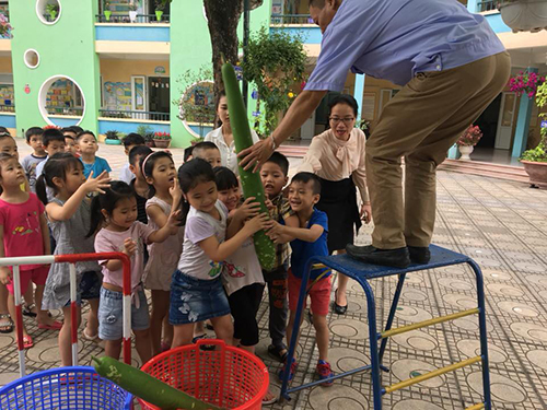 Bạn nào cũng muốn được sờ tay vào quả bầu, niềm vui và sự thích thú hiện rõ trên khuôn mặt của các con.Rất nhiều cánh tay giơ lên đón nhận những quả bầu vừa dài vừa nặng từ tay bác bảo vệ