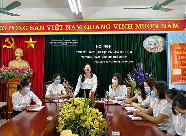 Đảng viên trường mầm non Phúc Đồng lắng nghe báo cáo viên trình bày chuyên đề năm 2021