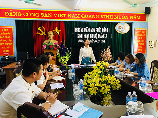 Thực hiện sự chỉ đạo của Đảng bộ phường Phúc Đồng và quy chế sinh hoạt chi bộ định kỳ hàng tháng của trường MN Phúc Đồng, vào hồi 13h30’, thứ ba, ngày 05 tháng 3 năm 2019, 12/12 đồng chí đảng viên đã có mặt đầy đủ dự buổi sinh hoạt chi bộ và sinh hoạt chuyên đề tháng 3 dưới sự chủ trì của đồng chí Đỗ Thị Thanh Tâm - Bí thư chi bộ nhà trường .