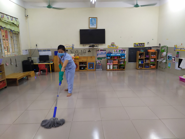 Tổng vệ sinh chiều thứ 6 hàng tuần”, Ban giám hiệu nhà trường phân công nhiệm vụ cụ thể tới từng bộ phận trong đó nêu rõ trách nhiệm và những công việc cần phải thực hiện nhằm đảm bảo tốt nhất việc phòng tránh dịch bệnh. Thực hiện tổng vệ sinh tẩy rửa, khử khuẩn toàn bộ các khu vực trong và ngoài lớp học đặc biệt là những đồ dùng đồ chơi, bàn ghế, tay nắm cửa. Tiến hành thông thoáng toàn bộ lớp học, thu gom rác thải đúng nơi quy định, xử lý triệt để các vật dụng có nước đọng để diệt loăng quăng bọ gậy, lau chùi rửa đồ chơi ngoài trời…