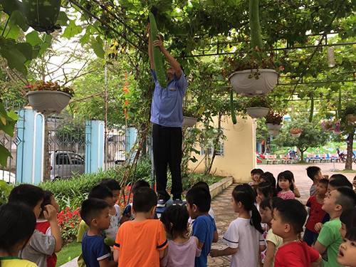 Bé nào cũng vui, thích và cười rất tươi. Niềm vui của các bé cũng chính là niềm vui của tập thể cán bộ giáo viên trong nhà trường. Với hoạt động đầy ý nghĩa mang đậm tính thực tiễn đã trang bị cho trẻ nhiều kỹ năng cần thiết và phù hợp. Việc tiếp xúc với thiên nhiên không chỉ giúp các bé vận động nhiều hơn mà việc làm vườn còn mang đến cho các bé những kỹ năng sống có giá trị thực sự cho sự phát triển nhân cách và tâm hồn của trẻ thơ. Qua đó, trẻ hiểu rõ được vai trò của con người trong hoạt động chăm sóc giàn bầu, làm thế nào để có vườn rau tươi tốt như vậy? Bên cạnh đó, giúp trẻ khám phá thiên nhiên sẽ khơi gợi cho các bé trí tò mò, ham hiểu biết và yêu lao động.