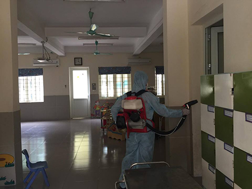 Một số hình ảnh của đội phòng chống dịch đến phun thuốc muối tại trường mầm non Phúc Đồng.