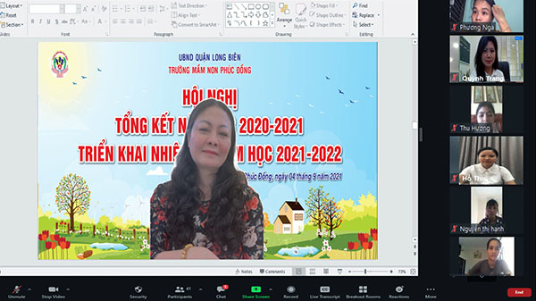 Thực hiện công văn số166/PGD&ĐT ngày 26/8/2021 của PGD&ĐT quận Long Biên V/v tổ chức lễ khai giảng và triển khai 01 số nhiệm vụ đầu năm học 2021-2022. Sáng thứ 7, ngày 14 tháng 9 năm 2021 trường MN Phúc Đồng đã tổ chức thành công Hội Nghị tổng kết năm học 2020-2021 và triển khai nhiệm vụ năm học 2021-2022 theo hình thức trực tuyến trên phầm mềm zoom.us. Chỉ đạo, điều hành Hội nghị là đồng chí Lưu Thị Nhận – Hiệu trưởng nhà trường cùng 100% CBGVNV trong trường đã dự đông đủ.