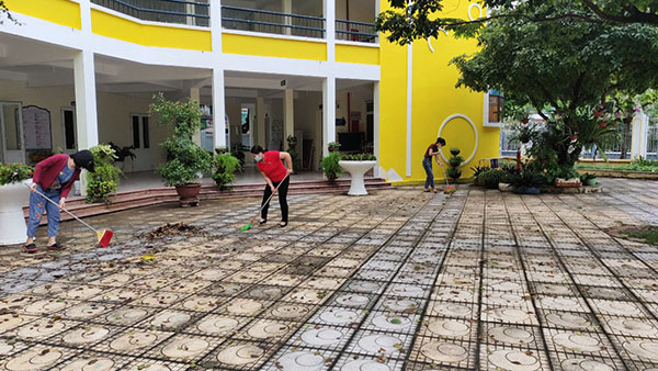 Theo lịch phân công của BGH đúng 8h00 phút sáng - 100% CBGVNV nhà trường đã có mặt và chia thành các bộ phận, tổ, nhóm, quét dọn, sắp xếp đồ dùng, lắp đặt các thiệt bị sử dụng điện ở các phòng chức năng đồng thời lau chùi, cọ rửa, cắt tỉa cây, nhổ cỏ, đánh cọ rêu xung quanh sân trường, các khu vui chơi quanh khuôn viên nhà trường. Đặc biệt, do ảnh hưởng của cơn bão số 7, mưa triền miên trên diện rộng trong nhiều ngày qua nên việc rà soát toàn bộ các chậu cây, các thiết bị đồ chơi ngoài trời, bồn chứa nước tránh nước ứ đọng lại càng được chú trọng và xử lý cẩn thận hơn.