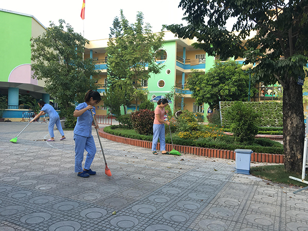 Các đoàn viên tổ nuôi và nhà trẻ vệ sinh khu sân sau và nhà bếp