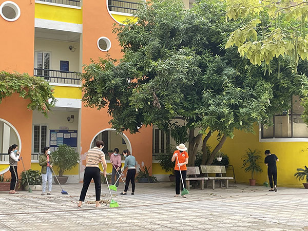 Cán bộ, giáo viên vệ sinh sân trường khu sân trước