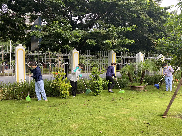Cô hiệu trưởng tham gia quét dọn sân trường